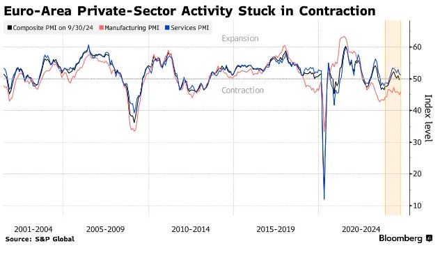 欧元区私营部门活动的 下行趋势 已延续至第二个月,德国和法国的活动减弱,产出受到影响,几乎没有复苏的迹象。数据显示,标普全球的综合采购经理人指数在10月份小幅上升至49.7,较上个月的49.6略有上升——仍低于50的分界线,表明增长与收缩的分界。结果并未缓解人们对该地区在2024年强劲开局后再次陷入停滞的担忧。