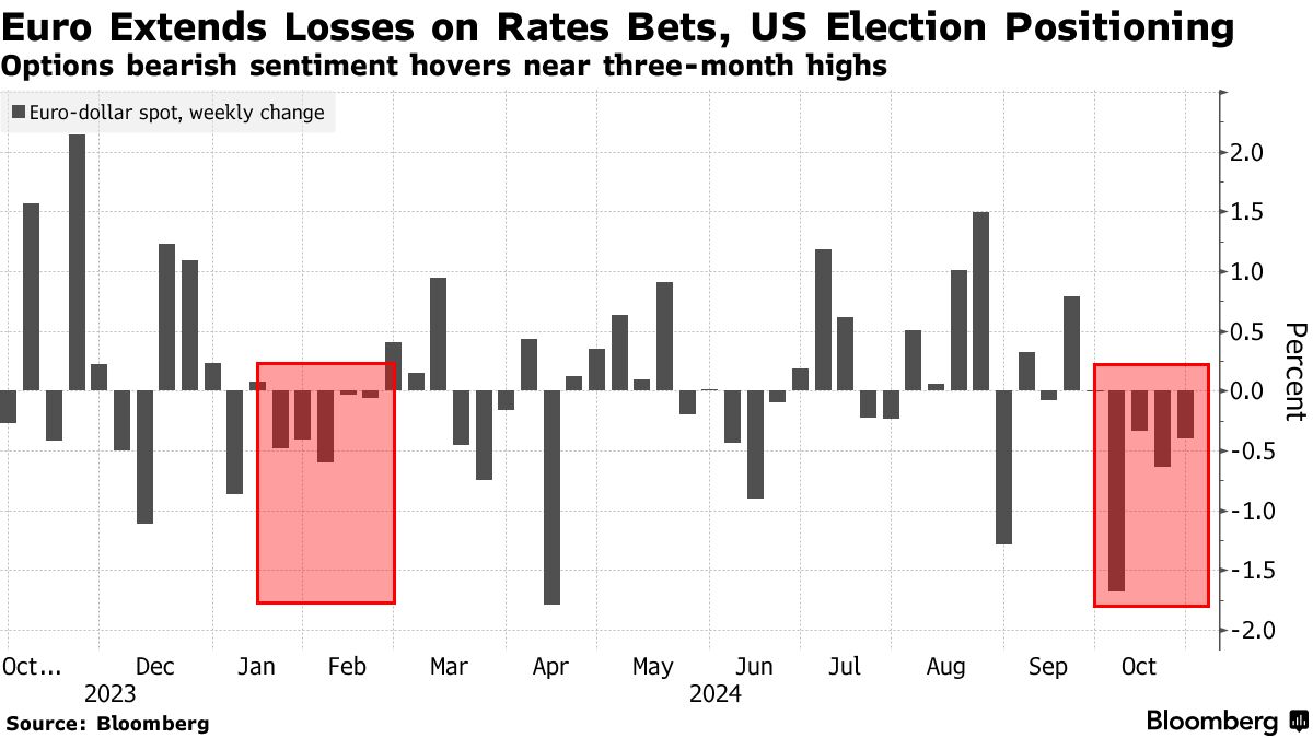 欧元正朝着八个月以来最长的周跌幅前进,受到市场对欧洲中央银行可能在十二月降息半个百分点的预期增加的压力。