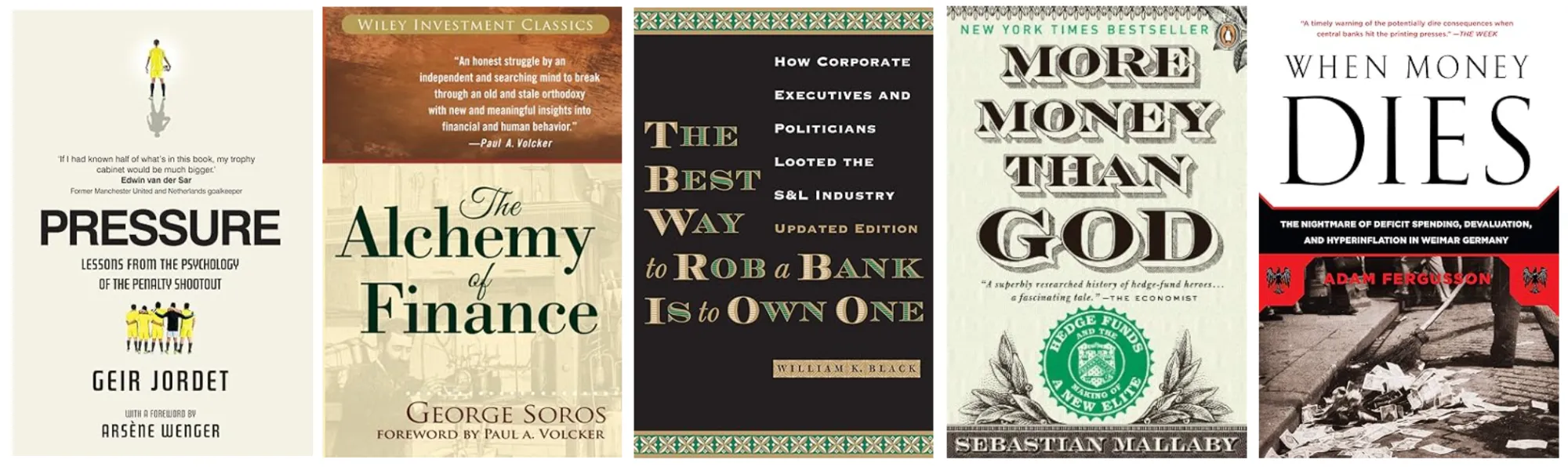 他推荐了压力:点球心理学的教训,作者是Geir Jordet(“对投资也有高度相关的教训”),金融的炼金术,作者是George Soros(“对市场心理的洞察非常深刻”),以及抢劫银行的最佳方式是拥有一家银行:企业高管和政治家如何掠夺S&L行业,作者是Bill Black,Huw说这是“关于监管捕获和银行可能出现的问题的最佳书籍。”