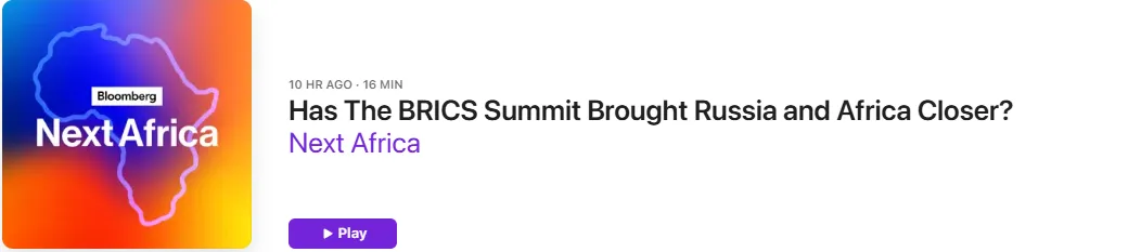 彭博社的亨利·迈耶和斯坦比尔·塞莱与詹妮弗·扎巴萨贾讨论峰会及俄罗斯与非洲的关系。索马里政府要求非洲联盟和联合国 将埃塞俄比亚士兵排除在 改组的维和部队之外,以对抗与基地组织有关的叛乱分子。该请求将加剧两国之间本已紧张的关系。关系在一月份恶化,当时埃塞俄比亚暗示可能承认索马里兰——一个北部的分裂地区——为主权国家,以换取进入一个索马里视为其领土的地区的港口和军事基地的机会。了解埃塞俄比亚争取红海通道的努力是如何 激怒邻国的。