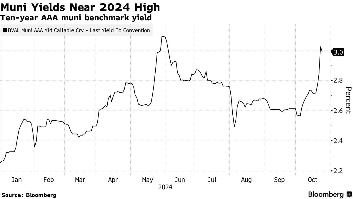 本周早些时候,市政债券收益率急剧上升,因美国国债的抛售以及强劲经济的迹象使投资者降低了对降息的预期。周四,市政债券反弹。