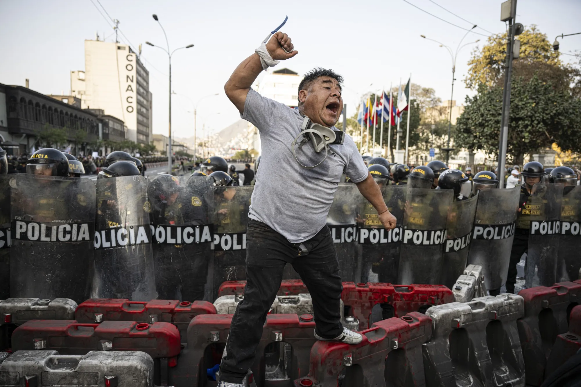 一名示威者在10月10日的利马抗议活动中在防暴警察面前高喊口号。