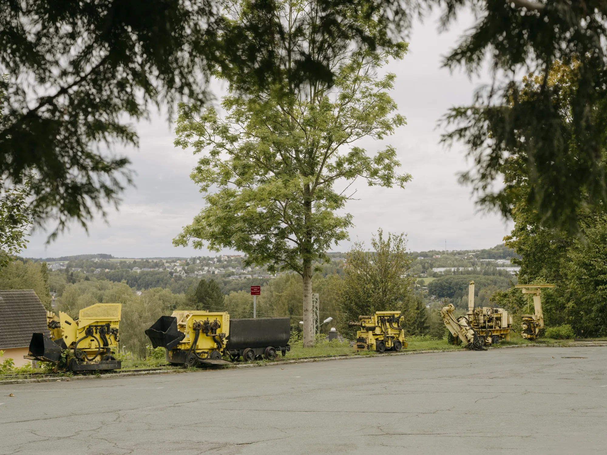 三十公里以西,在森林覆盖的高地和 Erzgebirge 的山谷中,位于 Aue/Bad Schlema,这是一个宁静的疗养胜地,坐落在一座宏伟山丘的阴影下。实际上,这是一片人造景观,源自战后时期的苏联矿业营地,强迫劳动者在这里挖掘铀,堆积放射性废料,并污染水源。