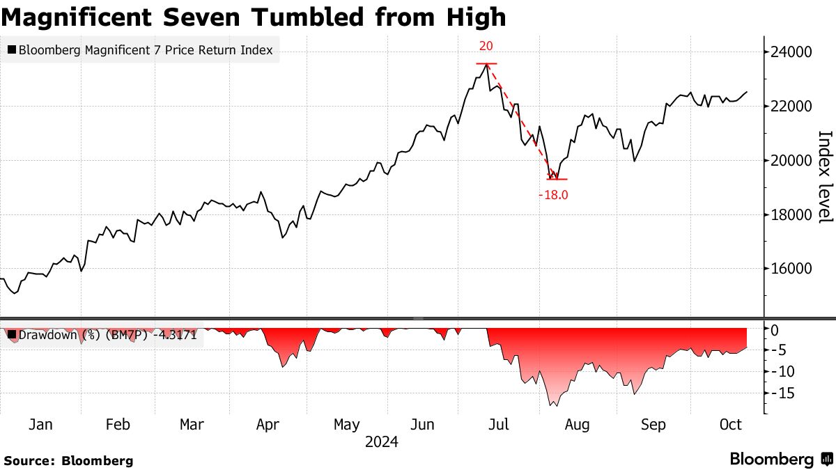 在第三季度,彭博社的“壮丽七巨头”指数首次落后于标准普尔500的等权重版本,即每只股票的权重相同,无论公司的市值如何。这是自2022年以来的首次。在标准普尔500中,自7月初以来,公用事业、房地产和金融行业一直是主导行业,而信息技术和通信服务几乎没有增长。