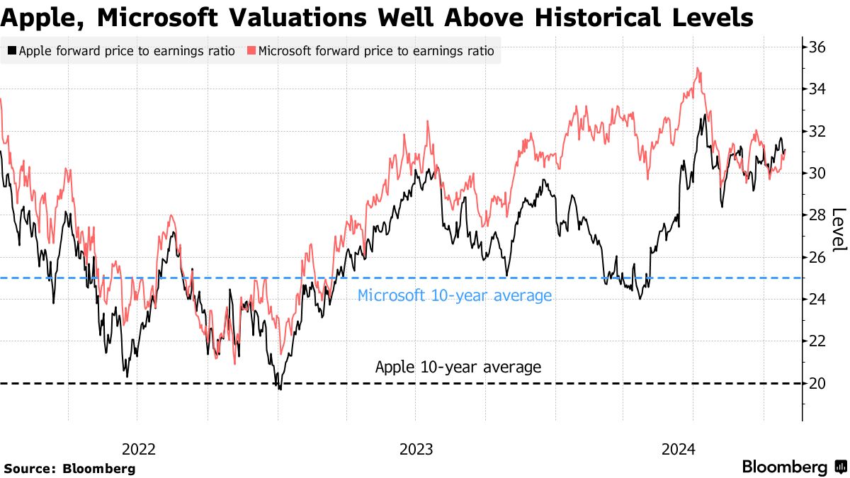 尽管大型股价格下滑,但许多公司的估值仍高于历史平均水平。根据彭博社汇编的数据,苹果的交易价格为未来12个月预计利润的32倍,而过去十年的平均水平为20倍。微软的价格为33倍,过去十年的平均水平为25倍。