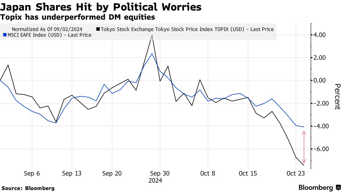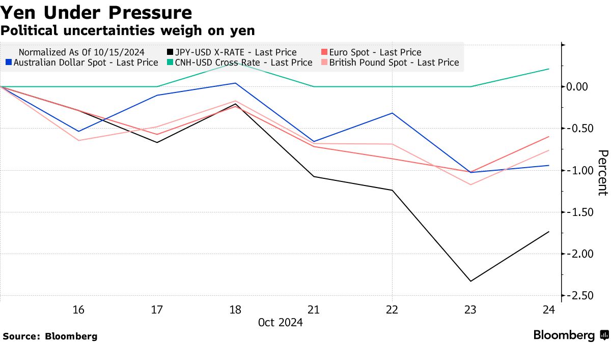 虽然货币贬值通常会支持日本股市,但投资者担心政治稳定将使首相石破茂的地位受到质疑。芝加哥交易的日经225期货开盘下跌,暗示东京市场可能开盘下跌超过1%。