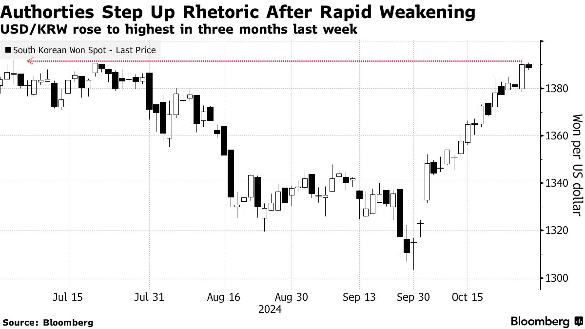 韩国加入了亚洲越来越多的官员的行列,担忧他们的货币表现,因为美元的复苏在该地区引发了震荡,交易员们预计如果唐纳德·特朗普重返白宫,将会实施全面的贸易关税。彭博社的亚洲货币指数已连续四周下跌,并在周一交易至自8月19日以来的最低水平。