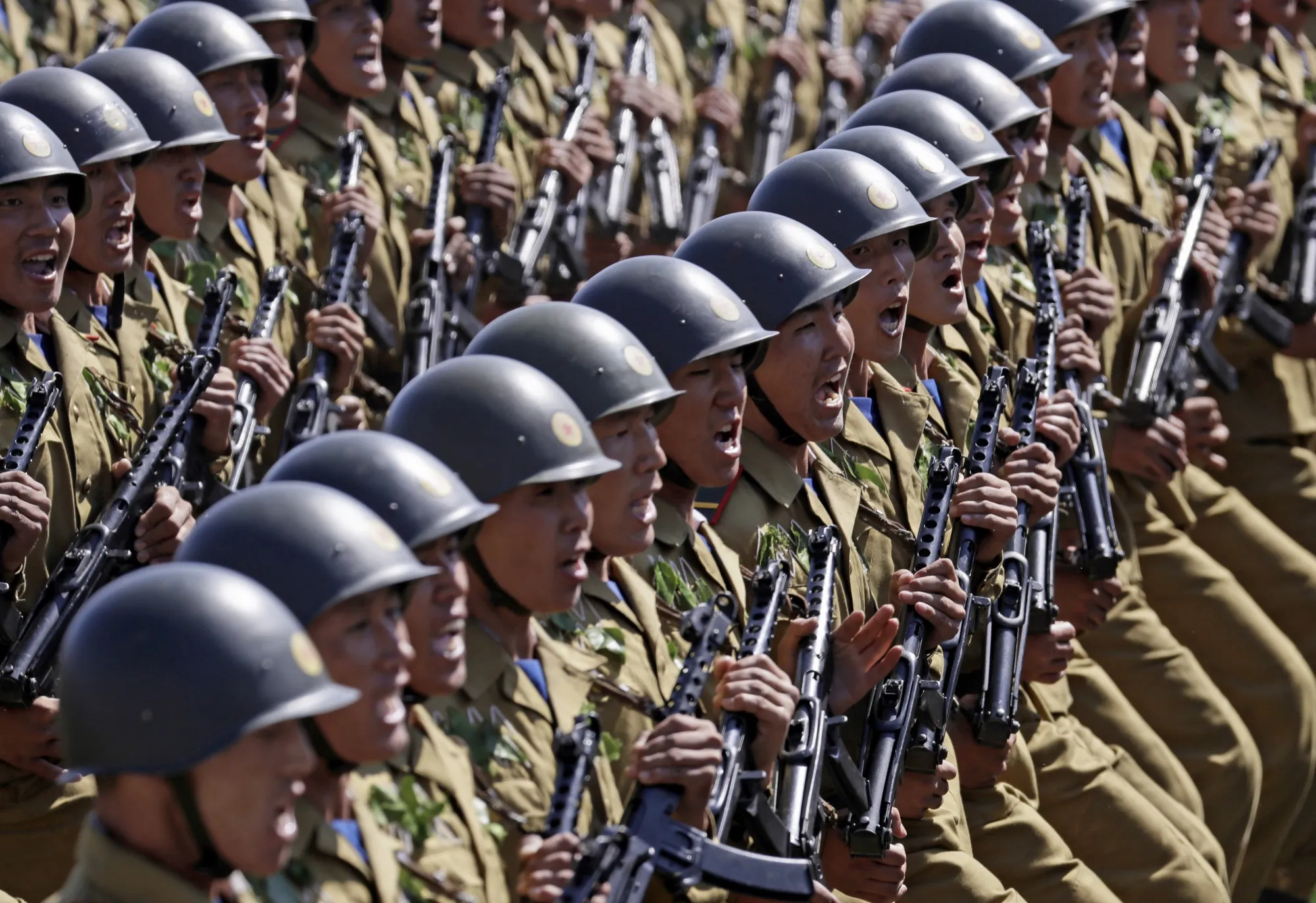 朝鲜士兵在朝鲜平壤的游行中。