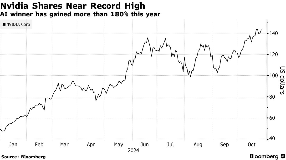 这种背景推动了英伟达的股价,同时首席执行官黄仁勋的保证也表明其新款Blackwell芯片的生产进展顺利且需求旺盛。英伟达是人工智能计算设备重度支出的最大受益者。上周,该股创下历史新高,市值现在约为3.5万亿美元,略低于 苹果公司,后者仍是全球最有价值的公司。