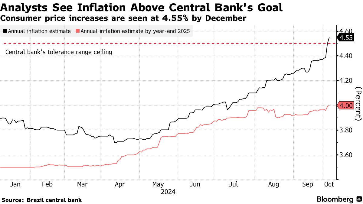 巴西分析师连续第四周上调2024年的通胀预期,现在预计消费者价格将超过容忍范围,因为投资者对公共支出表示担忧。