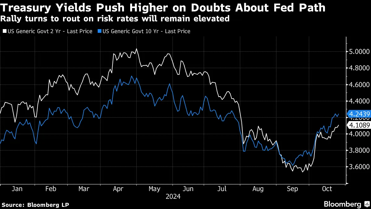 尽管美联储上个月开始放松货币政策,降息0.5个百分点,但交易员们排除了美国中央银行会继续快速降息的预测。这一变化发生在数据显示经济正在以相对快速的速度扩张之后。因此,收益率大幅上升,推高了各市场的借贷成本,并使国债自四月以来首次出现月度亏损。