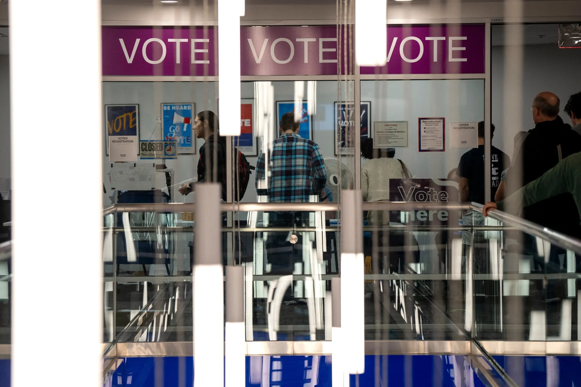 选民在弗吉尼亚州阿灵顿的提前投票期间排队投票。