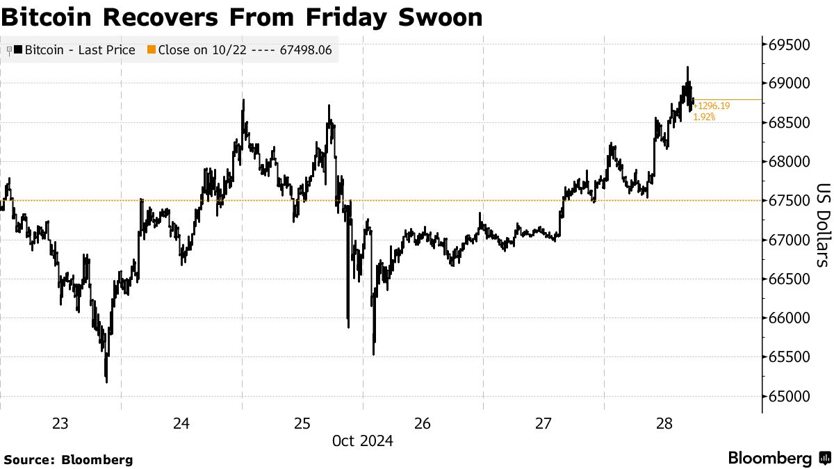 比特币 交易者再次瞄准6月最后一次达到的70,000美元价格水平,此前加密货币在周五晚间短暂下跌,而美国交易所交易基金继续保持稳定的资金流入。
