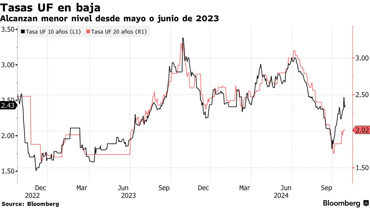 十年期UF利率从七月初的3%降至九月底的1.82%,这是自2023年5月以来的最低水平。共同基金解释了大部分需求,因为中央银行的降息降低了短期存款的吸引力,智利BTG Pactual资产管理公司的固定收益经理Francisco Mohr表示。十月份的大多数债务销售超过了1亿美元。