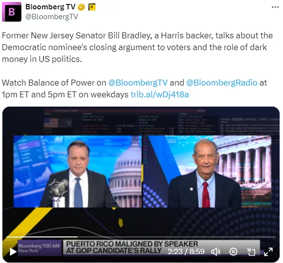 今天在彭博电视台的 权力平衡早间版中,主持人乔·马修和凯莉·莱因茨采访了前新泽西州参议员比尔·布拉德利,一位哈里斯支持者,讨论了民主党提名人向选民的最后论点以及黑金在美国政治中的作用。