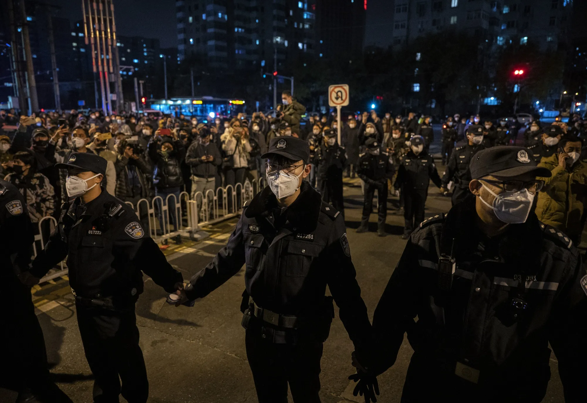 2022年,在北京抗议中国严格的清零政策时,警方形成了警戒线。摄影师:凯文·弗雷尔/盖蒂图片社虽然卢的兴趣是政治,但他的数据库——免费提供——是越来越多的跟踪中国异议的指标之一,投资者正在关注这些指标,以弄清习近平何时会放松政策以促进增长。一些银行现在也开始开发类似的产品。