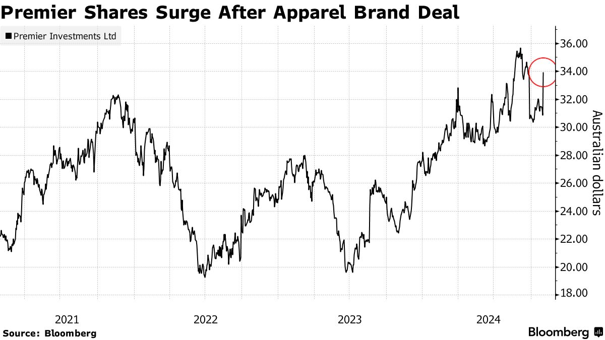 总部位于墨尔本的百货商店运营商将以890.5万新迈尔股票的价格收购首席的五个服装品牌,双方在周二的声明中表示。刘将继续担任首席的董事长,并加入迈尔的董事会。首席的股票上涨了多达18%,是三年来最大的盘中涨幅。