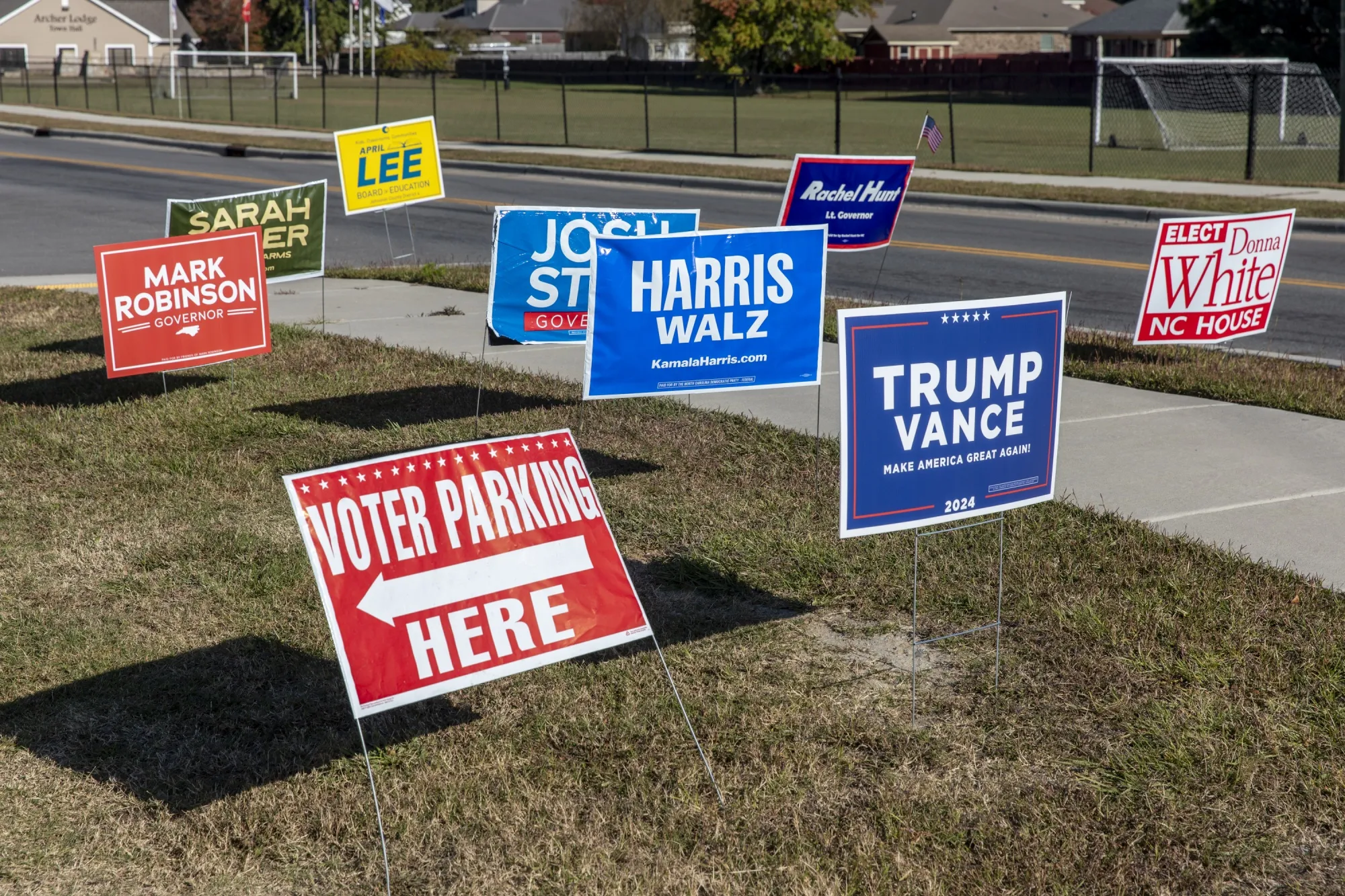 在北卡罗来纳州阿彻洛奇的阿彻洛奇社区中心外,早期投票期间的竞选标志。