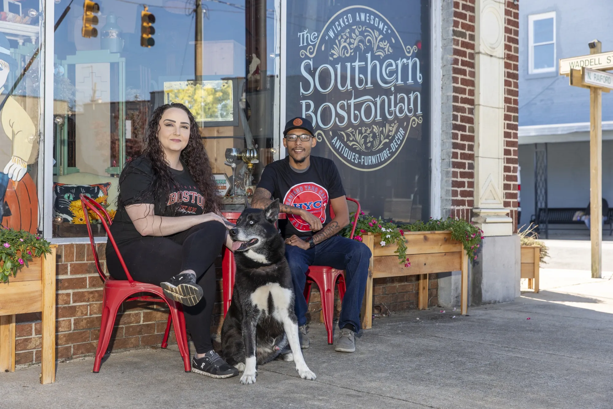 克里斯蒂娜·杰弗里斯与她的丈夫亚历克斯和他们的狗特朗普,在塞尔玛的南波士顿商店外。摄影师:瑞秋·杰森/彭博社“我所有五只狗都是以总统的名字命名的,”杰弗里斯说。“在我得到特朗普之后,还有彭西(副总统迈克·彭斯的名字)。我还有MAGA、KAG(让美国再次伟大)和自由。”虽然彭西就像特朗普的前搭档一样,已经不再是这个家庭的一部分。杰弗里斯说,她被一个朋友收养了。“我不再有她了。”