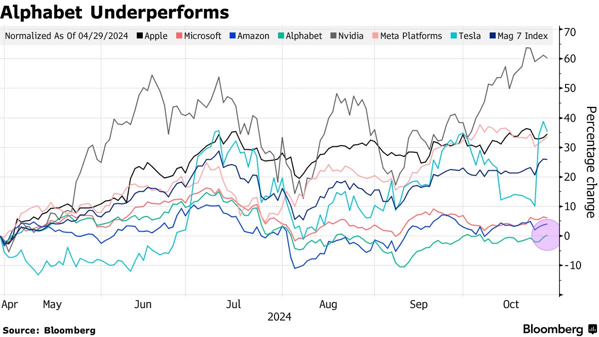 在过去六个月中,字母表的股票基本持平,是科技巨头中表现最弱的。彭博社“七大巨头”总回报指数在此期间上涨了近26%。