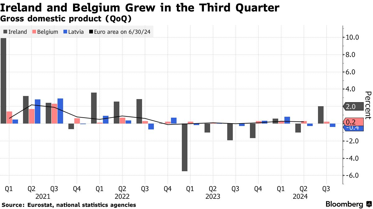 根据都柏林统计局周二的报告,爱尔兰国内生产总值在截至九月的三个月内增长了2%,而前一个时期则收缩了1%。比利时的增长势头略微放缓,增幅为0.2%——低于0.3%。