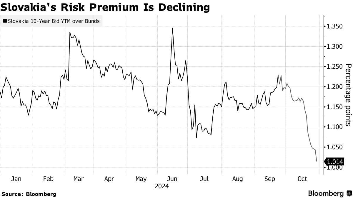投资者要求持有斯洛伐克10年期债券相对于可比德国证券的额外收益率从6月的峰值下降了超过30个基点,周二降至1.01个百分点。
