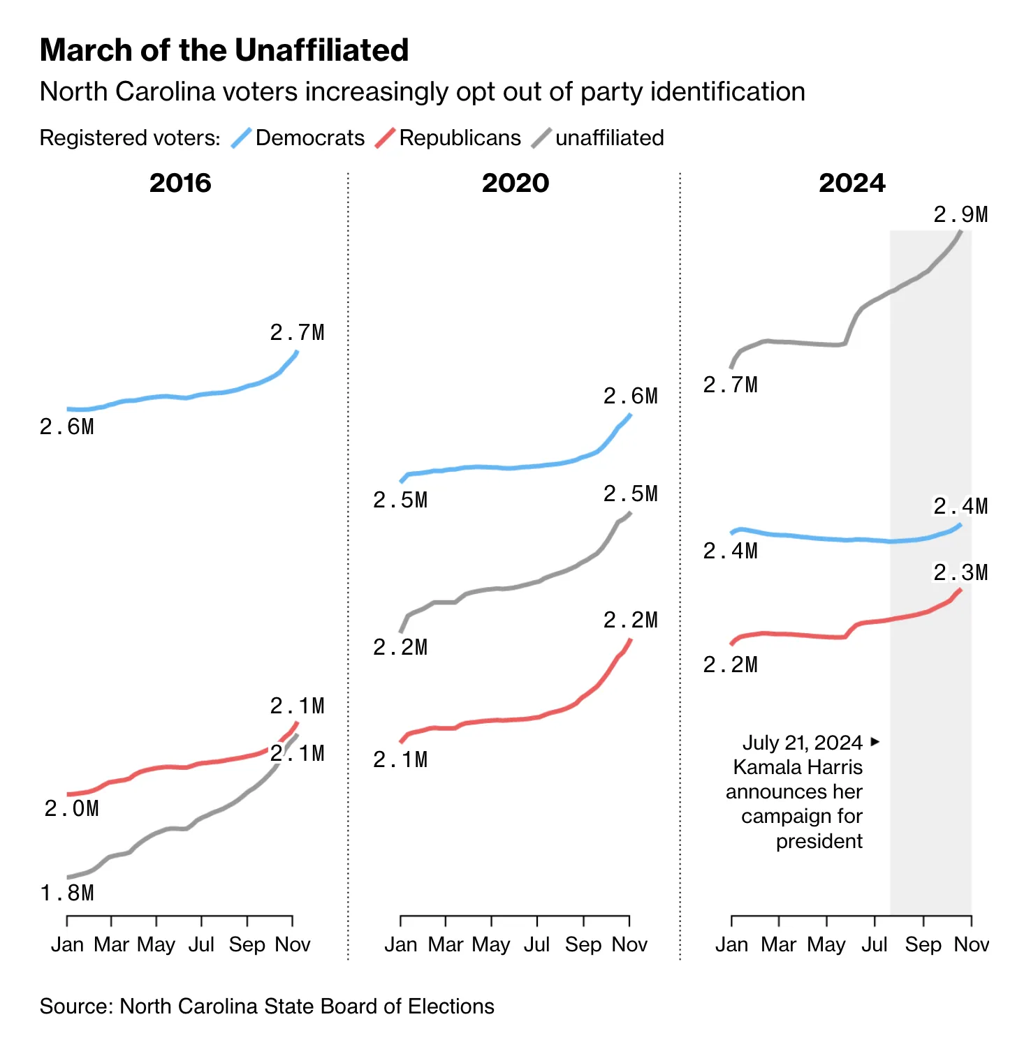 类似的变化正在亚利桑那州、乔治亚州和其他关键战场州上演,为下周的选举做准备。这是2020年趋势的延续,当时郊区决定了选举结果。然而,变化的模式并不保证今年民主党会获胜:北卡罗来纳州的政治归属分析显示,选民越来越倾向于不认同任何一方。阅读肖恩·多南、安娜·埃德格顿、克里斯托弗·坎农和安德烈·塔塔尔的更多报道**今天在CityLab上:**北卡罗来纳州蓬勃发展的郊区正在改变选举地图
