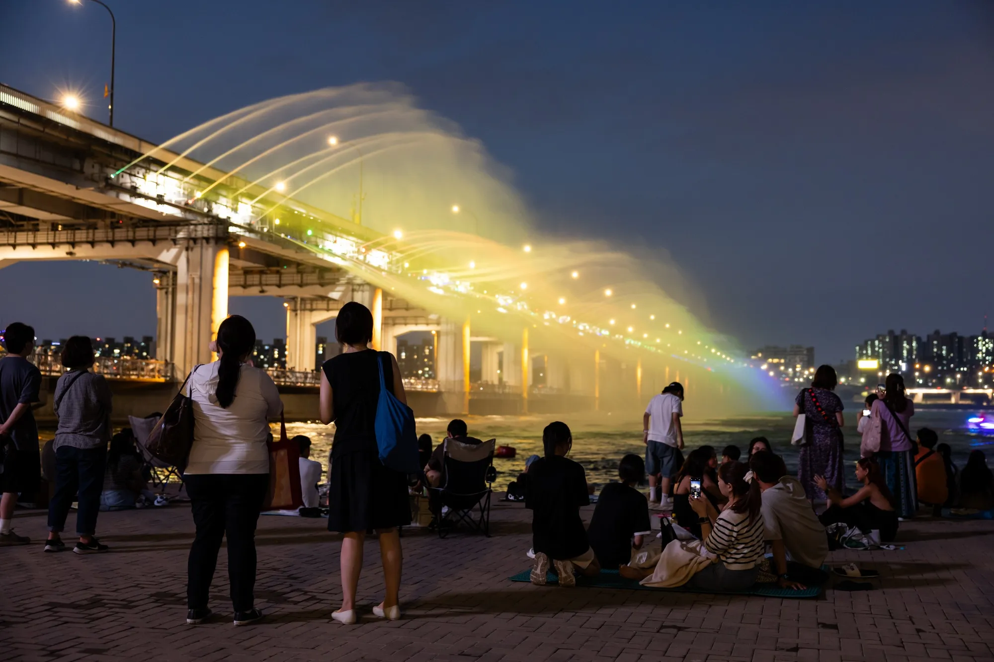人们在2024年8月4日星期日晚上观看从韩国首尔的半坡彩虹桥喷出的水。