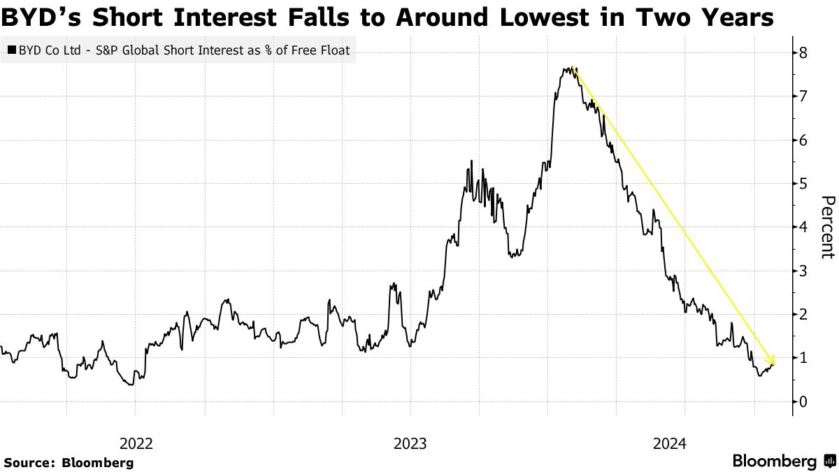 根据标普全球公司的数据,比亚迪在香港上市的股票的空头利息占自由流通股的比例已从今年早些时候的7.7%降至周五的0.9%。看跌押注现在接近自2022年7月以来的最低水平。在期权市场中,对股票下跌的对冲成本也有所下降。