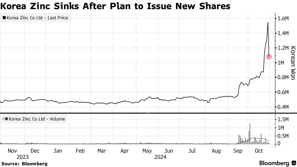 此次发行是在公司股价自9月中旬以来几乎翻倍之后进行的,此前公司的最大股东Young Poong Corp.和私募股权公司MBK Partners Ltd提出了收购控股权的非自愿报价。该财团目前控制着韩国锌业超过38%的股份。