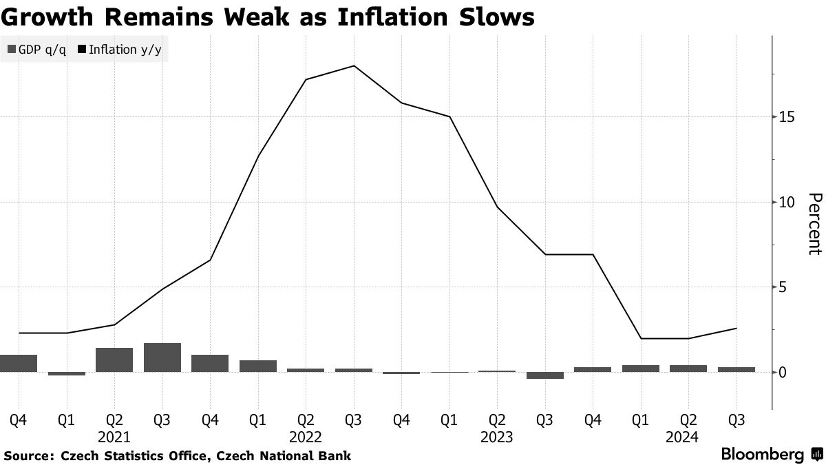 捷克经济在第三季度的增长低于预期,家庭消费持续复苏,但对主要市场(尤其是德国)的出口仍然疲软。