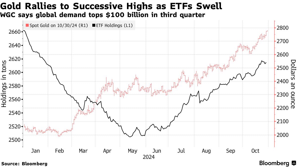 随着降息周期的开始,WGC预计将会加大对黄金的配置,地缘政治的不确定性——尤其是与下周即将举行的美国总统选举结果几乎无法预见的情况相关——是投资者逃向安全港的另一个原因。