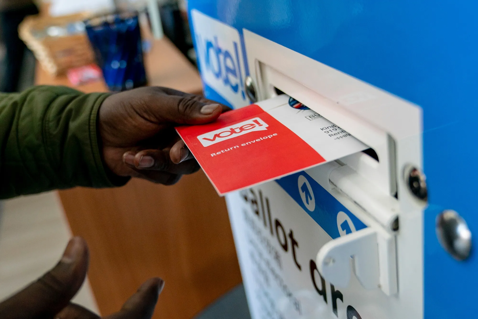 一名选民在华盛顿伦顿的投票箱中提交选票。摄影师:大卫·赖德/彭博社**在竞选活动中,**唐纳德·特朗普试图摆脱关于种族主义言论的争议,他表示将没收毒贩和帮派的资产,以补偿受害者。卡马拉·哈里斯表示,另一个特朗普总统任期将会是混乱的,并誓言如果当选将与国会合作进行移民改革。