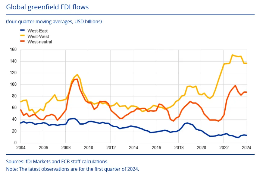 根据新的 欧洲中央银行研究,公司投资的决策越来越受到地缘政治的影响。将世界划分为 三个集团 — 一个以美国为中心的西方集团,一个以中国为中心的东方集团,以及一个中立的第三方 — 经济学家发现,西方公司近年来在友好国家的投资有所增加,而在政治上距离较远的国家的投资则有所减少。他们表示,财报电话会议中频繁提到的“友岸外包”证实了这一发现。