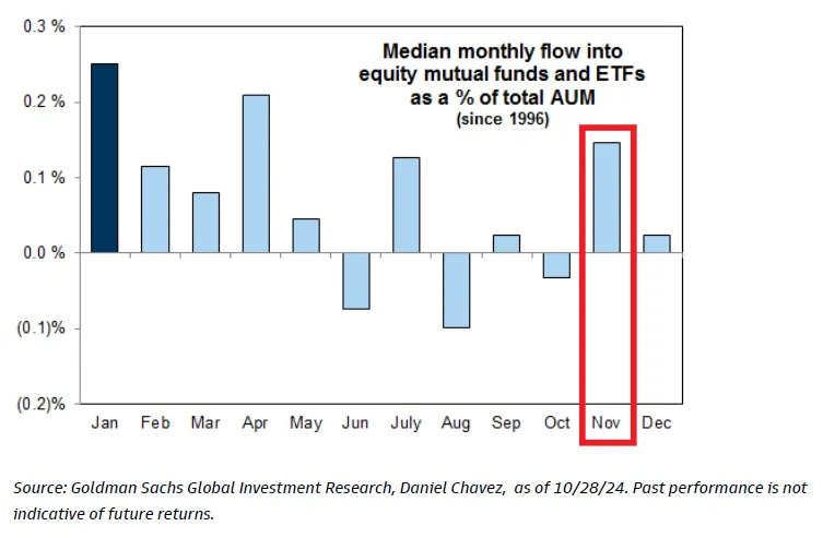 共同基金的卖出——通常是股票的最大抛售者——在月底逐渐减弱。预计这种情况将会逆转,11月通常会看到流入股票的资金,同时企业回购窗口重新开启,预计11月每天将有60亿美元的回购,来自高盛全球市场和战术专家的董事总经理斯科特·鲁布纳(Scott Rubner)表示。