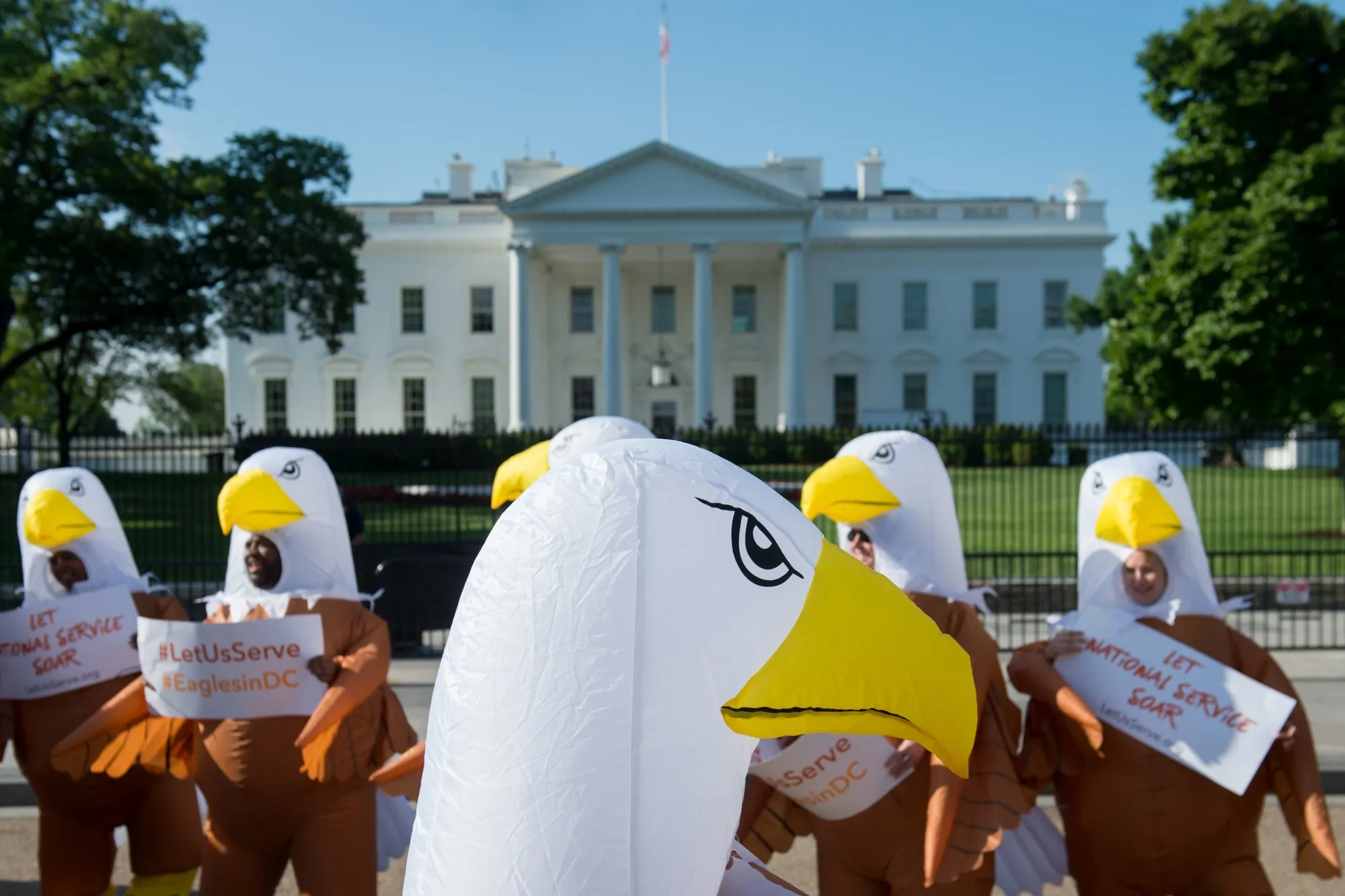 支持国家服务的倡导者们穿着秃鹰服装在2018年5月7日于华盛顿白宫前集会。摄影师:索尔·洛布/法新社/盖蒂图片社俄勒冈州的共和党众议员克利夫·本茨在2021年称联邦气候团体的想法是“妄想”。该计划的资金在2022年通货膨胀减缓法案中被删除,导致总统乔·拜登通过行政命令创建了ACC。这引发了共和党的反对,一些国会议员提出立法以阻止该计划。在拜登今年早些时候的请求中要求资金以扩大该计划时,倾向保守的参议院西部小组表示,可能更好的是把80亿美元烧掉。