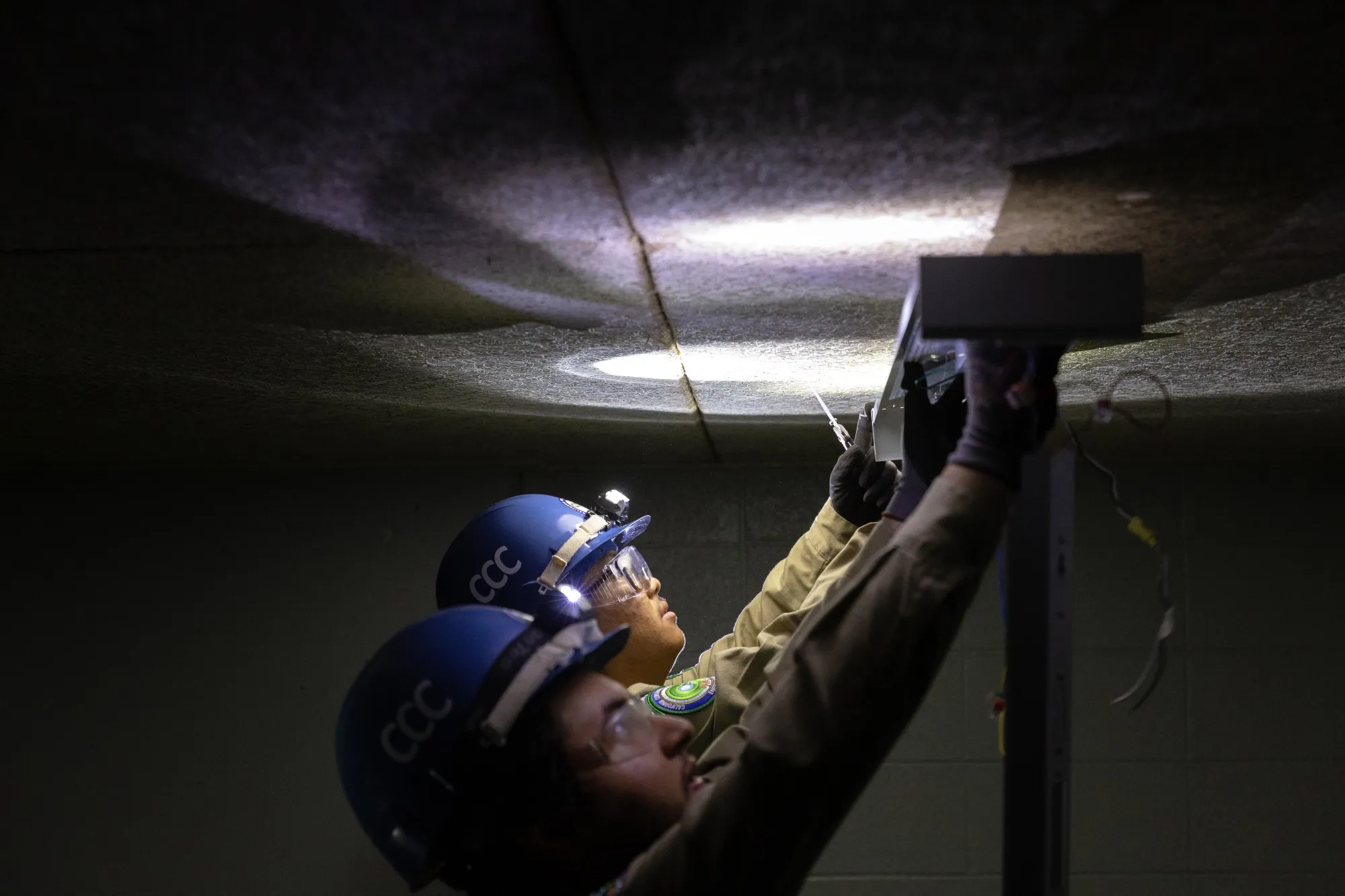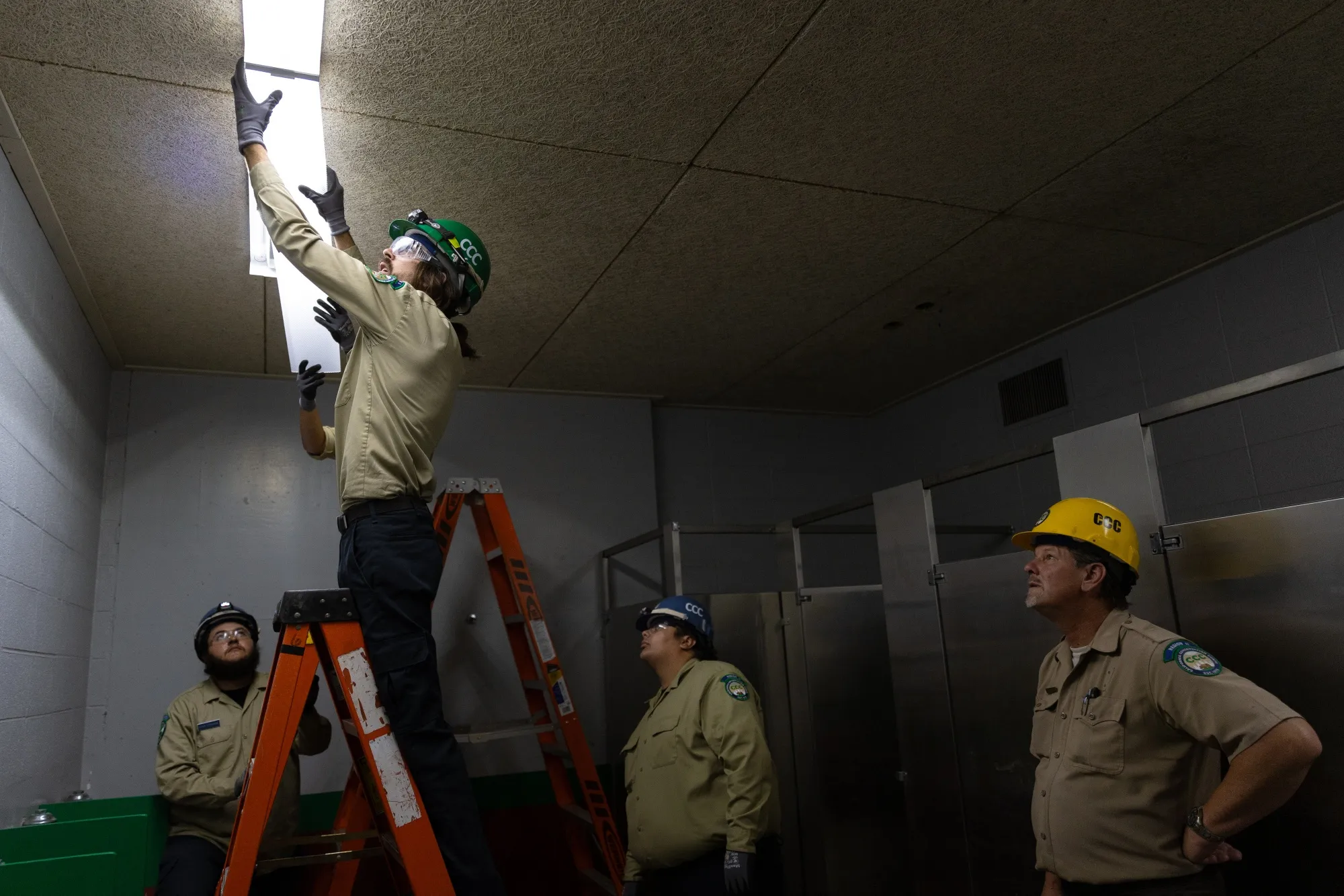 他们的任务是拆除加利福尼亚州斯托克顿一个庞大博览会场建筑内的旧荧光灯,并为LED灯具重新接线。他们是一个州服务组织的成员,但该项目现在也是 美国气候团(ACC)的一部分,这是一个旨在为年轻人提供临时工作的全国性项目,同时 为他们提供通往 联邦服务和气候相关职业的途径。