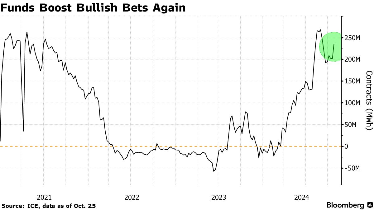 根据国际交易所(Intercontinental Exchange Inc.)周三发布的数据,基金在基准荷兰天然气期货中的净多头头寸上周上涨了近17%。尽管中东局势缓和的前景缓解了一些担忧,但这一举动显示出看涨情绪仍接近2021年以来的最高水平。