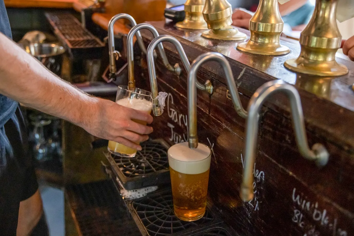 一名酒保在伦敦的一家酒吧倒了一品脱生啤酒。