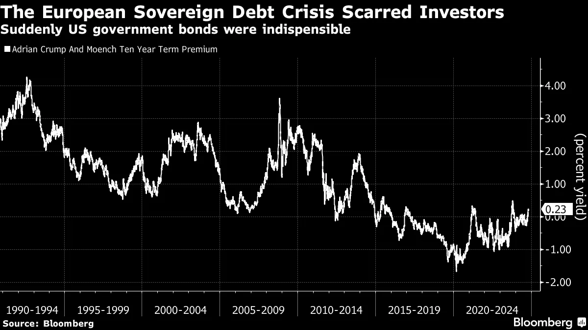 因此,我们可以用债券收益率说同样的话。安全资产不再稀缺。现在的威胁是它们太多了。因此,期限溢价正在上升。回到第一张图表,看看在2000年代和1990年代大金融危机之前的水平。那时,投资者通常要求1%、2%甚至3%的收益,以承担长期固定收益的风险。在1992年,这个数字甚至达到了4%。