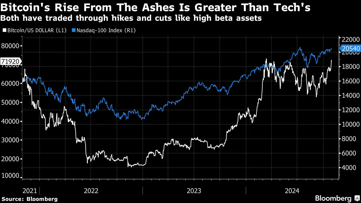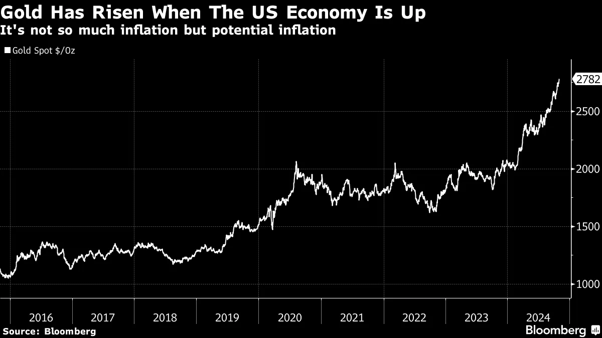 摄影师:亚当·格雷/彭博社随着美国总统选举在最后时刻仍然悬而未决,很多人都在谈论美国资产价格的变动作为“特朗普交易”。然而,我并不确定这就是我们所看到的。确实,如果交易者预计现在热衷于加密货币和关税的共和党人将重返白宫并减税,从而为联邦储备仍在努力降温的经济注入刺激,那么更高的利率和黄金、比特币及股票的上涨是符合预期的。但这也可以说是交易者基于经济已经走向的方向所应押注的——这越来越看起来像是温和着陆的金发女孩情景。
