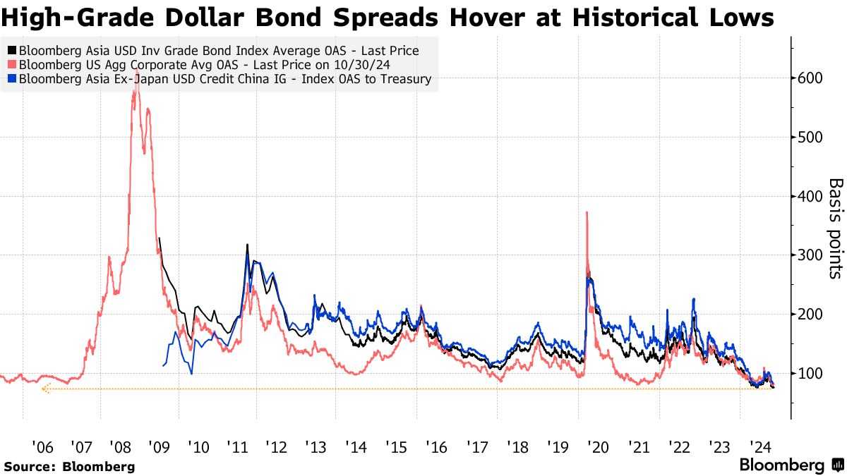 亚洲顶级发行人的美元债券利差在中国政策制定者通过一系列货币和财政刺激措施提升该地区债务吸引力后,缩窄至创纪录的低点。