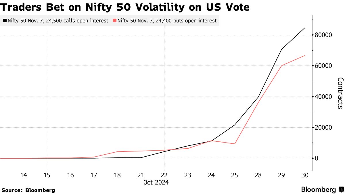 Nifty 50指数自上个月创下历史新高以来已下跌超过7%,原因是对印度公司盈利增长的担忧,而这些公司的财报季节正在进行中。与此同时,跟踪其波动性的指标本月上升了2.7点,为自5月以来的最高水平,因为交易者在等待美国总统选举的结果,而美国是印度最大的贸易伙伴。大多数民调显示,民主党候选人卡马拉·哈里斯与前总统唐纳德·特朗普势均力敌。