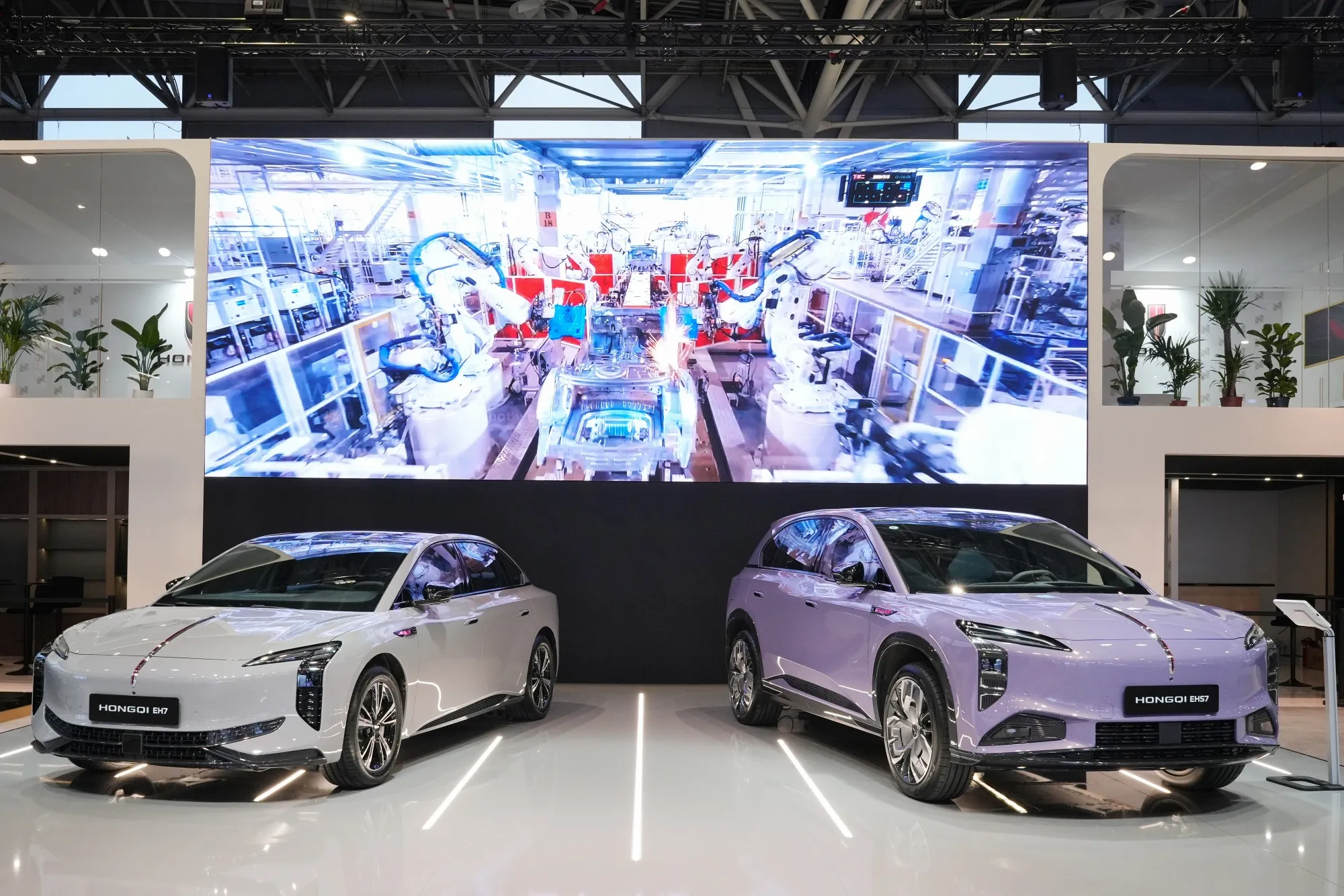 一辆红旗EH7,左侧,一辆由中国一汽集团制造的红旗EHS7电动汽车。