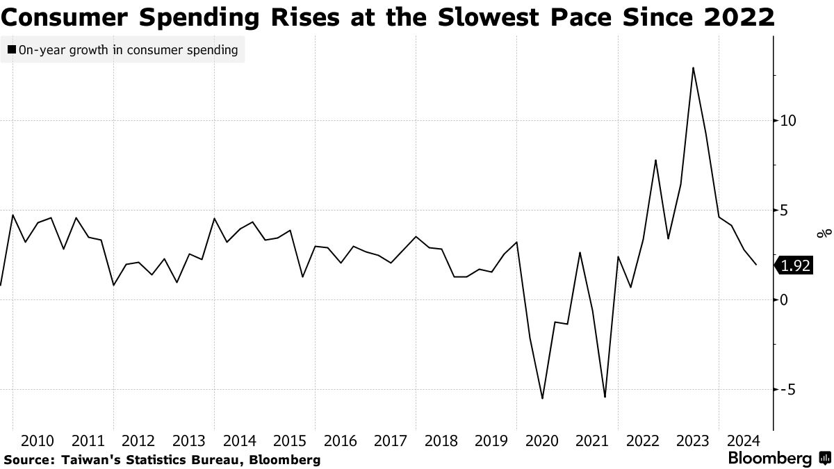 根据台北统计局周四发布的声明,国内生产总值在该期间同比增长了3.97%。这一增幅超过了彭博社对经济学家的调查中3.4%的中位数预期。消费支出增长了1.92%,是自2022年3月以来的最低水平。