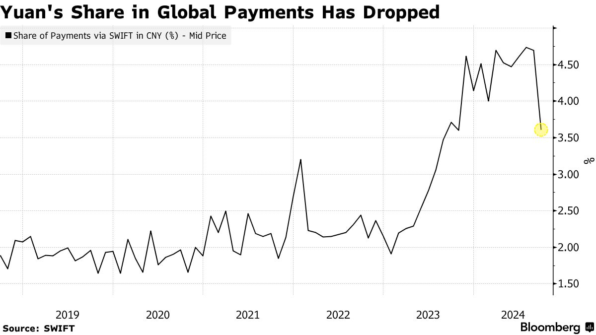 根据全球金融信息服务公司Swift编制的交易数据,上个月人民币在全球支付中的使用量创下历史最大降幅。