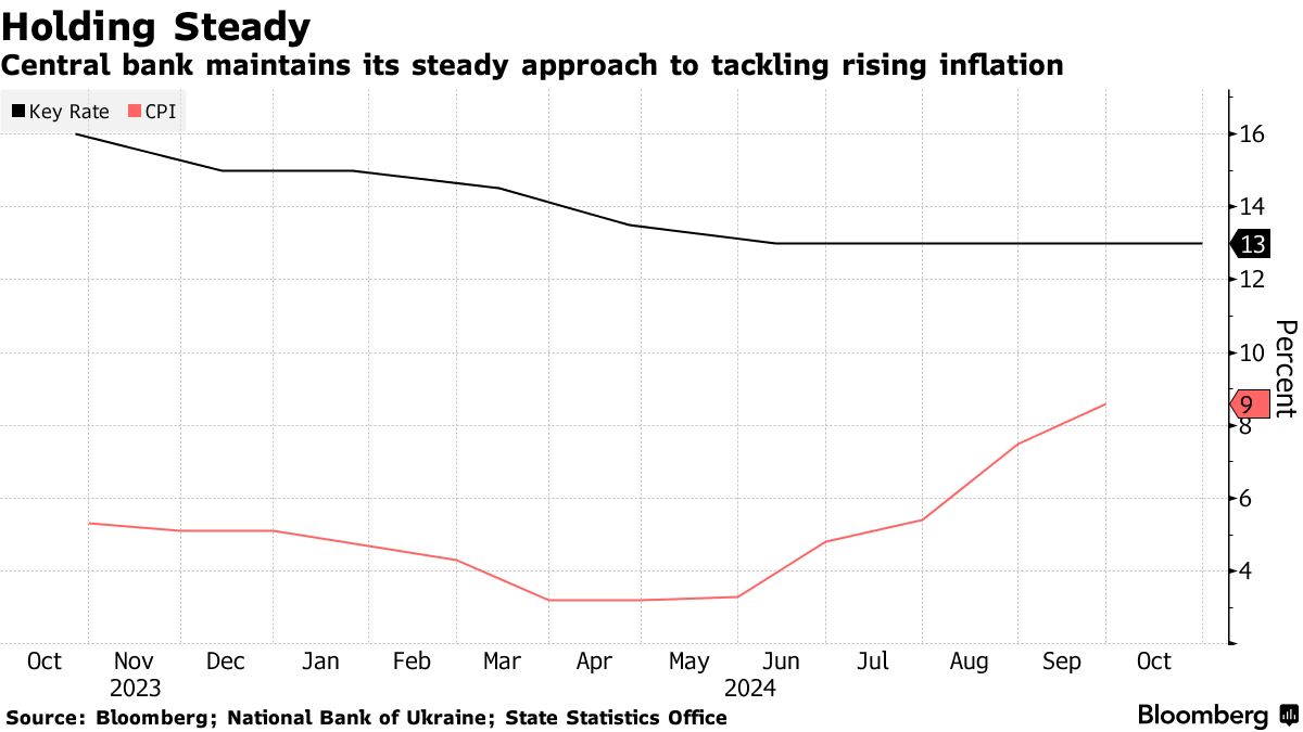 摄影师:安德烈·鲁达科夫/彭博社乌克兰维持利率不变,并表示借贷成本可能会保持不变,直到明年,因为这个饱受战争影响的国家的决策者正在评估通胀压力以及下周美国总统选举的结果。