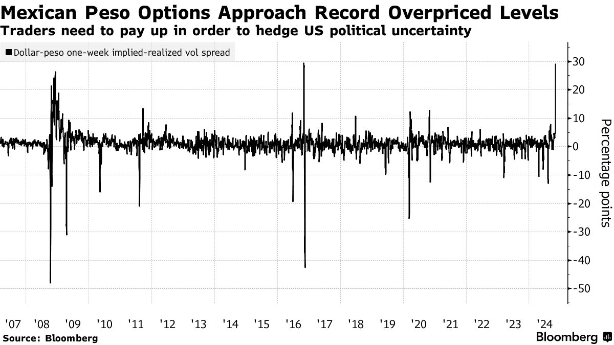 比索已成为一些投资者的 引雷针,因为它与美国的接近使其受到那里的执政者的独特影响,同时特朗普也誓言如果他赢得选举,将对迁往墨西哥的美国公司征收关税。
