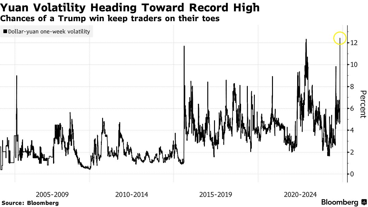 与此同时,离岸人民币的波动性——对许多全球交易者来说是一种更具流动性和可接触性的中国风险投资方式——接近历史最高水平。