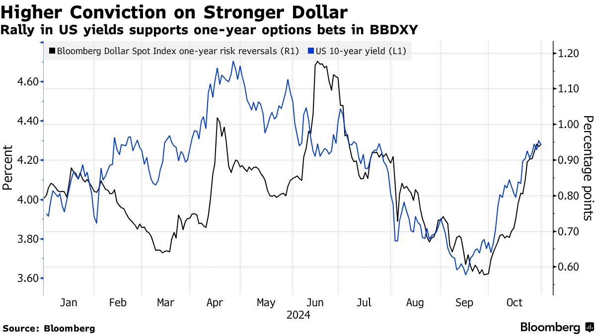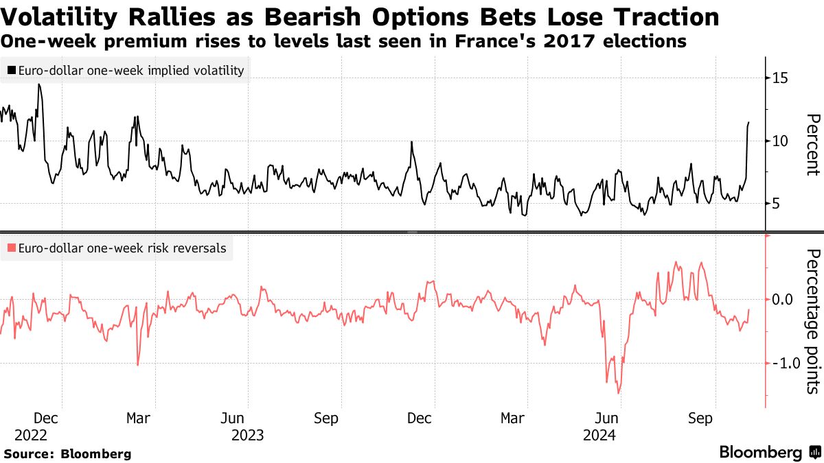 欧元的波动性——也容易受到特朗普胜利可能带来的任何贸易关税的影响——自2020年以来跳升幅度最大,目前交易价格为2023年3月以来的最高水平。所谓的风险反转——衡量购买而非出售该货币的期权需求——显示交易者对欧元仍持看跌态度,尽管近期针对短期波动的布局变得更加积极,与该货币在现货市场的反弹相一致。
